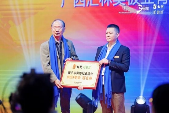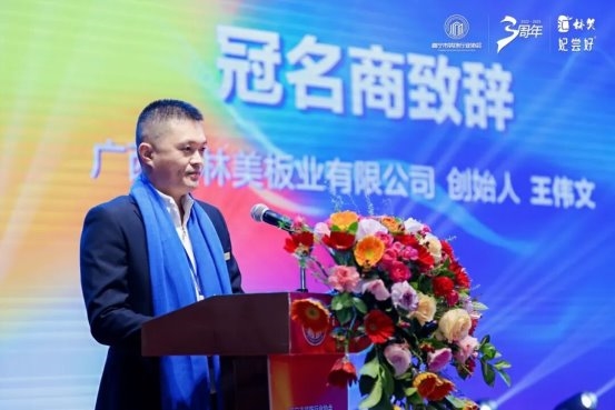 协会特别感谢本次活动的冠名单位——广西汇林美板业有限公司。王奕健会长为其颁发“冠名商荣誉奖牌”。公司创始人王伟文先生上台致谢,表达了与协会携手共进的意愿。