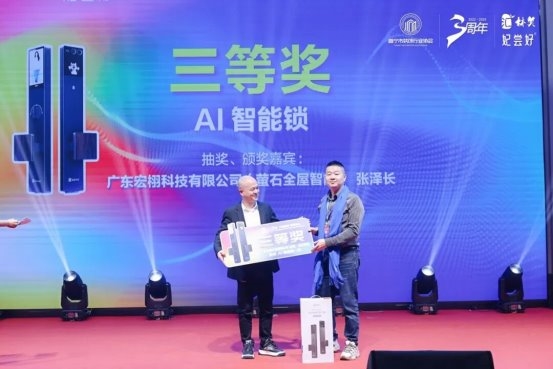 三等奖:普宁市云望建材有限公司与广东宏栩科技有限公司分别提供的智能灶与智能锁,由赞助商代表罗燕华、张泽长抽出。