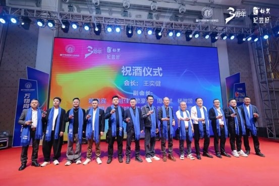 随后,王奕健会长携协会13位副会长共同登台,举行盛大的祝酒仪式。他们高举酒杯,向全场宾客敬酒,祝愿行业兴旺、协会昌盛、宾朋安康,现场气氛瞬间达到沸点。