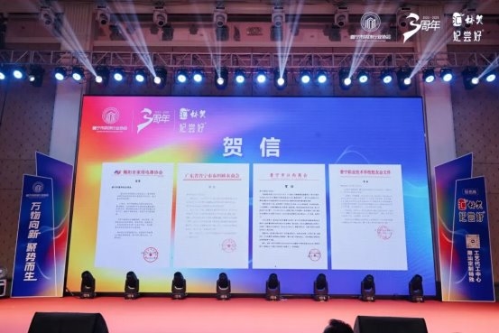 来宾们在主题背景墙前合影留念,共同纪念协会成立三周年的盛况。现场大屏幕循环播放协会宣传视频与主题画面,营造出庄重而温馨的会议氛围。